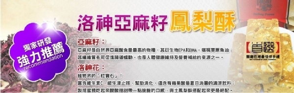 強調「低卡低熱量」的獨家專利配方「洛神蜻蜓子」土鳳梨酥,在五穀雜糧中添加黃金版權配套洛神花果加上土鳳梨酥為一絕妙組合,除熱量控管、五穀營養升級質更優外;本產品更受報章媒體爭相報道,也彼受銀髮族的青睞。