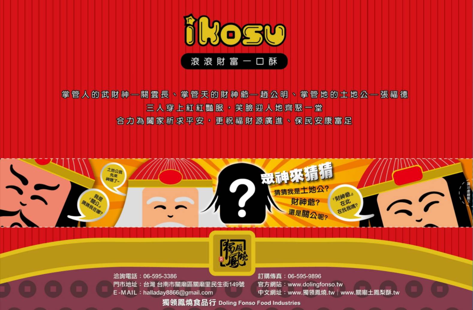 領鳳燒推出結合一口酥的財神版禮盒,涉及公、財神爺、土地公;象徵發財的財源滾滾禮盒,含一口酥、鳳梨酵素軟糖及手工鳳梨幹,多種旺來美味招財又獨納福。